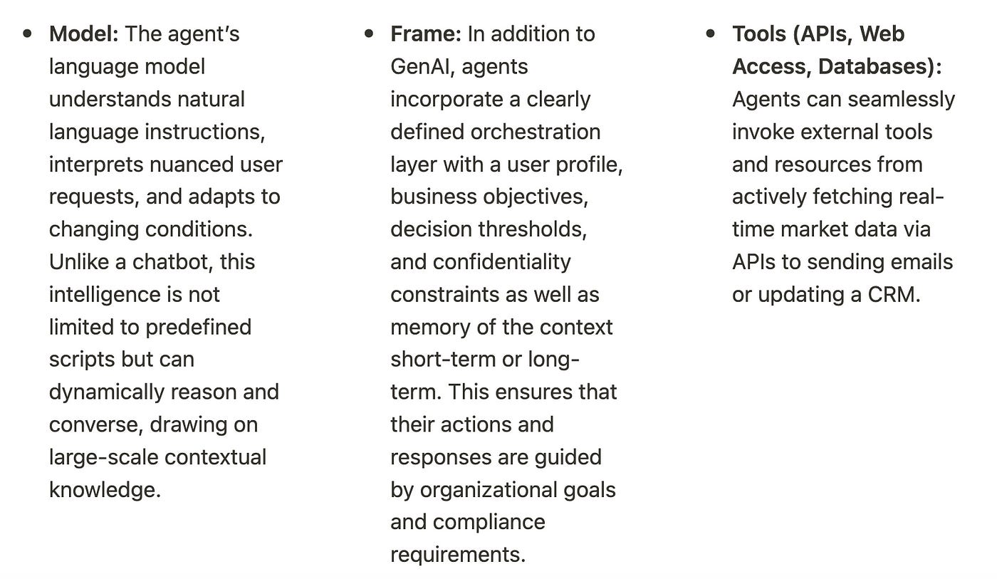 Agents are autonomous, contextually aware entities capable of executing tasks end-to-end. They combine advanced understanding with a structured decision framework and a set of integrated tools, pushing beyond the static workflows of Robotic Process Automation (RPA).