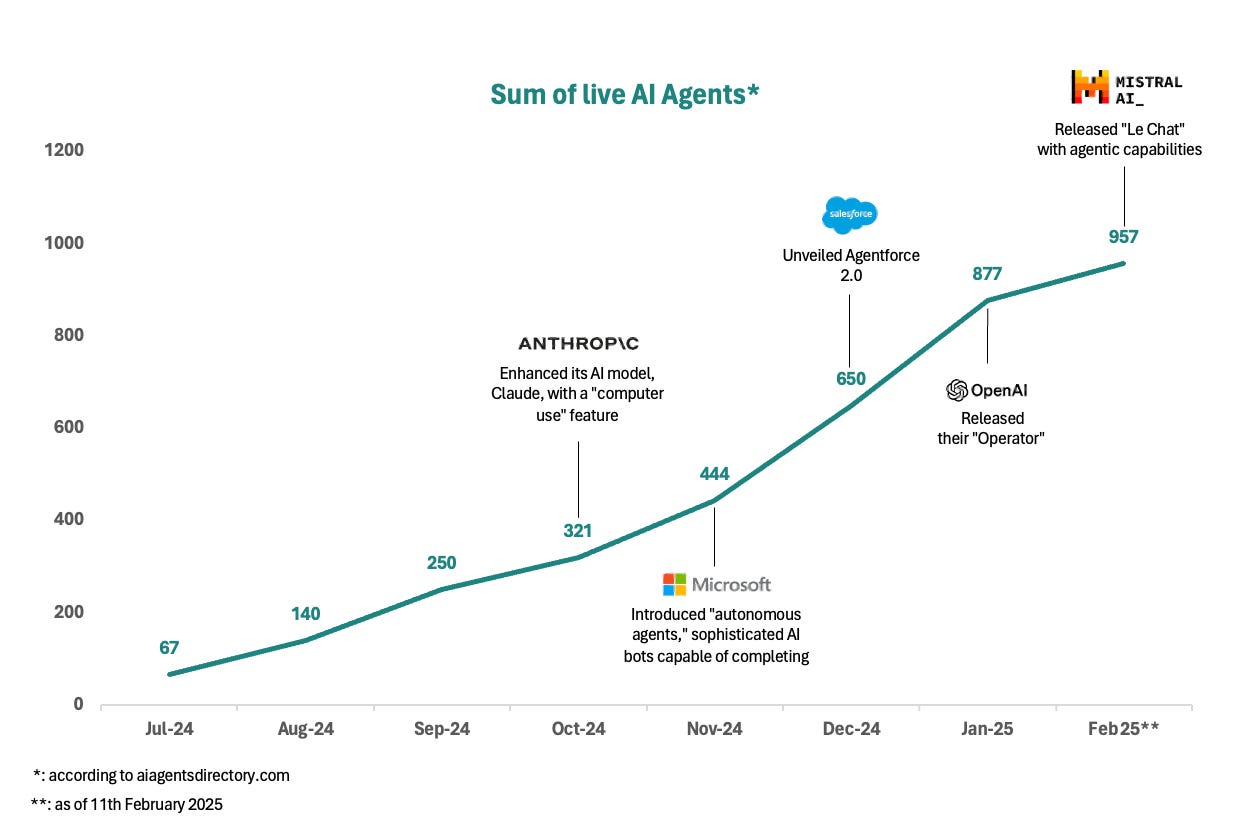 The numbers are undeniably in its favour. Since July 2024, we’ve observed an astonishing 14x increase in the number of AI companies classified as agents in the AI agents directory. However, the landscape isn’t just about new entrants: major players like Microsoft and Salesforce have launched their own iterations of agents, while Anthropic recently enhanced Claude with advanced agent-like features, OpenAI introduced its Operator to facilitate multi-step tasks and Mistral is expected to follow suit with multi-step agents and data connectors. The number of startups is growing, especially in the U.S., but we anticipate swift growth and adoption across EMEA. Globally, for context, over 60,000 AI companies are currently active, with 25% based in the U.S.