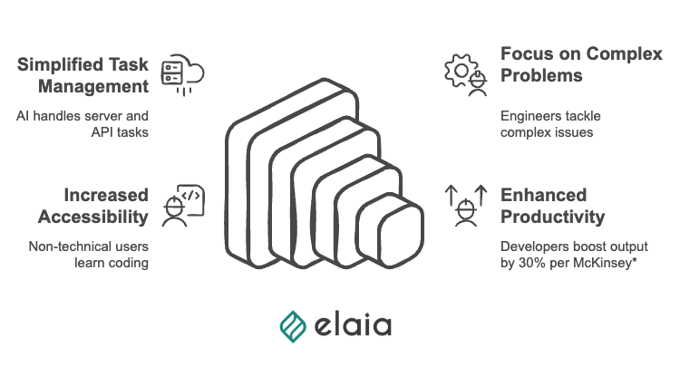 If the internet brought access to infinite knowledge to the people, AI has unlocked infinite know-how. Specialised skills like accounting (briefcase), logistics (cube), architecture (ark) or software development are now accessible via a wide range of applications and AI services. By simplifying complex tasks like server provisioning, memory management, and API integrations, engineers can focus on more complex tasks and problem-solving while increasing technology accessibility for a wider range of users. In the case of software development, tools developed by companies like Tabnine (Elaia portfolio company) and Cursor enable non-technical users to pick up coding practices more easily while seasoned developers can increase their productivity by 30%. This action-based knowledge paradigm shift is focused on creating greater efficiency, at all levels of the workforce and automating menial tasks.